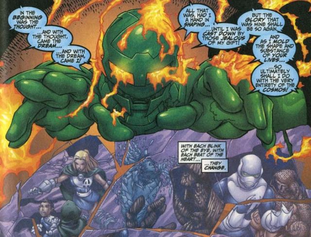 Then the Celestial returns in person, actually speaking (!) to Reed and Doom. He says his dreaming power is the power to shape entire universes. He shows Reed and Doom alternate universe versions of themselves. As tribute to Reed and Doom, the Celestial offers to give them powers equal to the Celestials themselves. Reed says the Celestial is speaking to them instead of destroying them outright, so he must believe Reed and Doom have a real chance to stop him. He and Doom then deduce twelve keys around the room, which must be activated by twelve keepers.