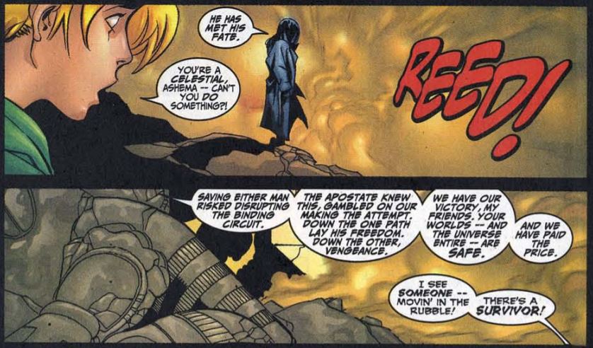 Doom uses force field tech in his armor to help Reed stretch through all twelve keyholes, just as the shadows break in and consume Valeria and then Doom. Then a voice calls out “Traitor!” and the Celestial screams in pain. It’s Ashema, who has arrived from the other universe thanks to Reed’s efforts. She defeats the Celestial in a blast of energy. The FF and the Generals are freed from the shadows’ influence. Everyone gathers at the sarcophagus, only to find that Reed and Doom are gone. Ashema says they gave their lives to save the universe. But then, one survivor emerges from the wreckage.
