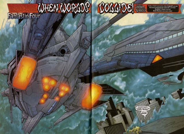 The wave hits New York, but instead of destroying the place, there’s a weird bit where life goes on in the city, except underwater. Reed deduces that the wave is occurring only in space, but not in time. The FF and Doom’s ship are in the eye of the storm, meaning they’re on their own. They have to act fast before the storm and Earth merge permanently.