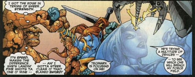 The FF and Doom’s generals start to fight again, but Reed stops them, saying they have to work together to stop the Celestial. Then everyone is attacked by a black inky substance. These creatures are known only as the “shadows,” and they are the Celestial’s security system. The shadows’ gooey stuff somehow mind-controls Sue and Divinity, and then Johnny and Shak’ti are knocked into the shadows. Reed tries to help him, but now Doom rejects his help. Doom zaps Reed unconscious and runs off with Reed and Valeria. Dorma and Technarx succumb to the shadows next, leaving only Ben and Lancer, fighting side-by-side.