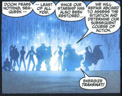 Fade out: Sue is quick to point out that Reed and Doom have switched places before. This is a reference to one of the classics, way way back in issue #10.
