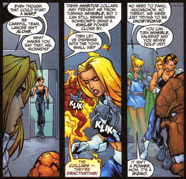 SUE-per spy: In the 2019 Invisible Woman miniseries, it’s revealed that Sue has been a S.H.I.E.L.D. agent all this time. This issue has Sue able to tell when someone else near her is invisible, even when she has the inhibitor collar on. Could this be spy training in use?