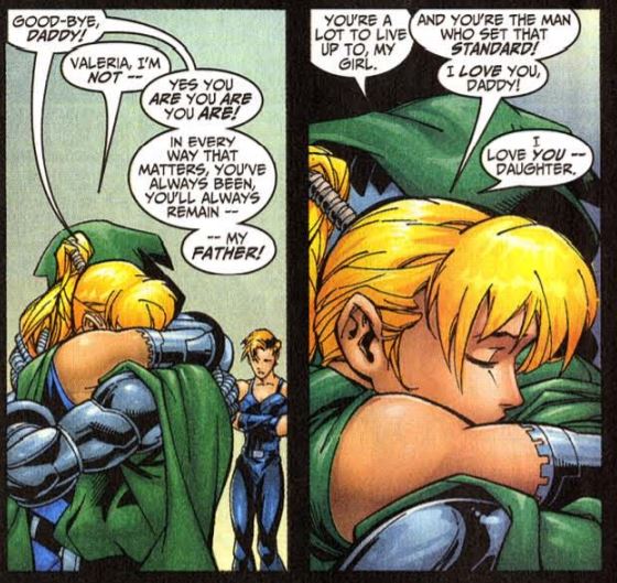 Elsewhere in the ship, the FF and Doom’s other three generals – Technarx, Dorma, Shak’ti, and Divinity. Dorma succeeds in decapitating Sue (!), only to reveal that this is all a hologram simulation for the generals’ training. The real FF are inside a cell inside the ship, wearing inhibitor collars that depowers them. Valeria and Lancer sneak in to free them, with Reed-as-Doom following them. Still impersonating Doom, Reed says he intends to send Valeria away to join Franklin, who was put on a record and sent off to safety two issues back. There’s a lengthy goodbye scene as Valeria says farewell to each of the FF. She hugs Reed, thinking he’s Doom, saying “You’ve always been, you’ll always remain… my father!”