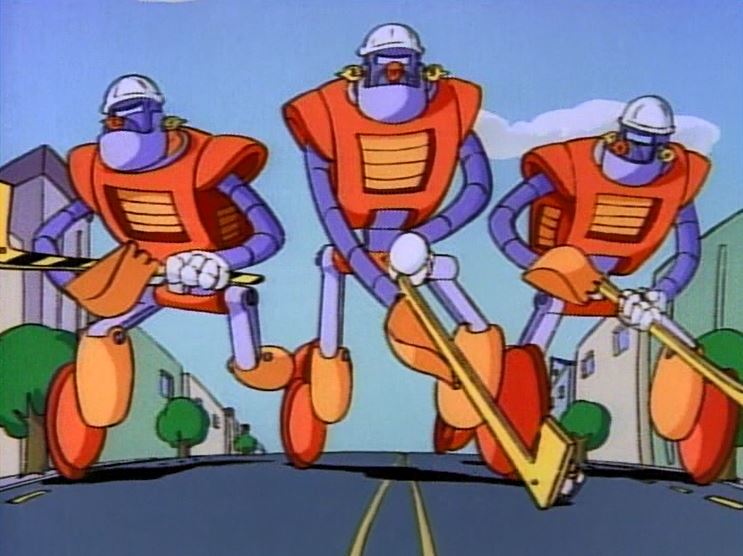 The chase next leads back to the construction site, where the robot is buried in quick-drying cement. The mayor then outlaws the robots, and Scrooge’s company gets the job of repairing all the damage the robots did.