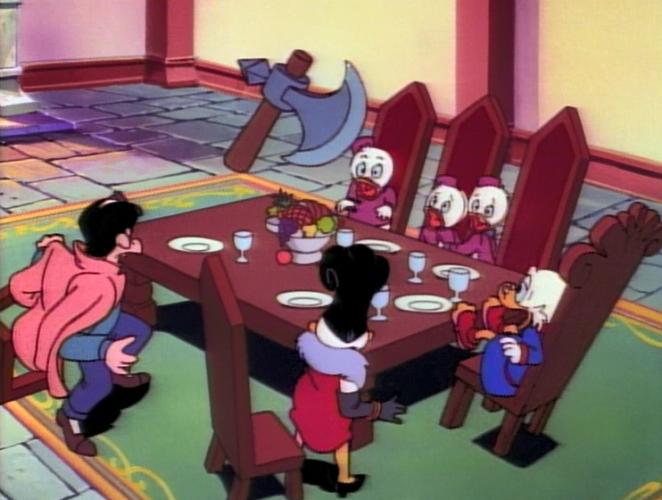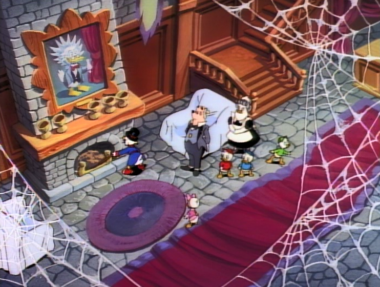 Here’s what happens: Scrooge has purchased an old castle that he plans to convert to a hotel. He got a good deal on the place, because it is supposedly haunted by the ghost of an old scientist, Dr. Ludwing von Strangeduck. Mrs. Beakely and the nephews are recruited to be the new waitstaff.