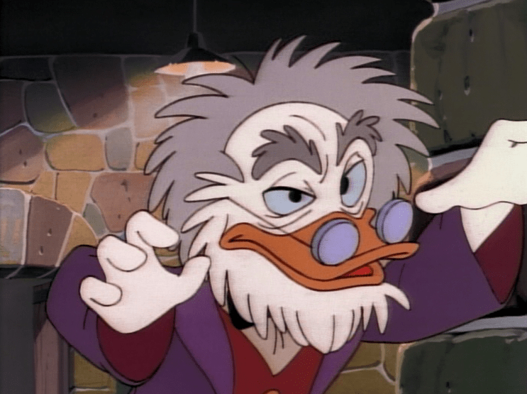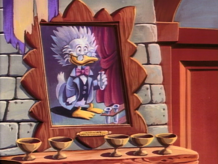 Scrooge and the ghost fall into the castle moat, revealing the ghost to be Dr. Strangeduck’s former lab assistant Bernardo. Then Dr. Strangeduck himself shows up, coming out of hiding to bring Bernardo to justice. Also, the duchess is Dr. Strangeduck’s long-lost sister. Strangeduck agrees to sell his inventions to Scrooge, and Scrooge gives him and his sister the castle in exchange.