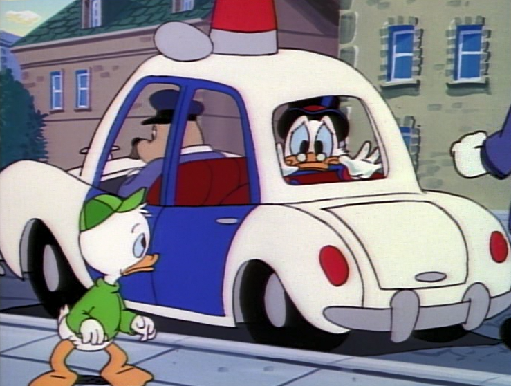 Here’s what happens: Scrooge is arrested for grand theft after a famous painting is found in his cellar. Flintheart Glomgold insists that Scrooge stole the painting from his personal collection. The evidence is stacked against him at the trial, so he’s off to jail. Huey, Dewey, and Louie investigate on their own, spying on Glomgold’s suspicious activity with a mysterious stranger.