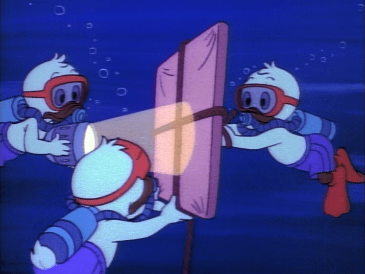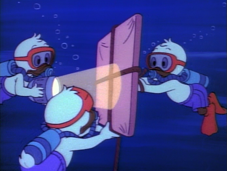 Junior woodchucks: Add scuba diving to the nephews’ list of skills, as that’s how they recover the portrait after its thrown in the river. The mysterious stranger the nephews pursue is character named Pierre, who never appears again.