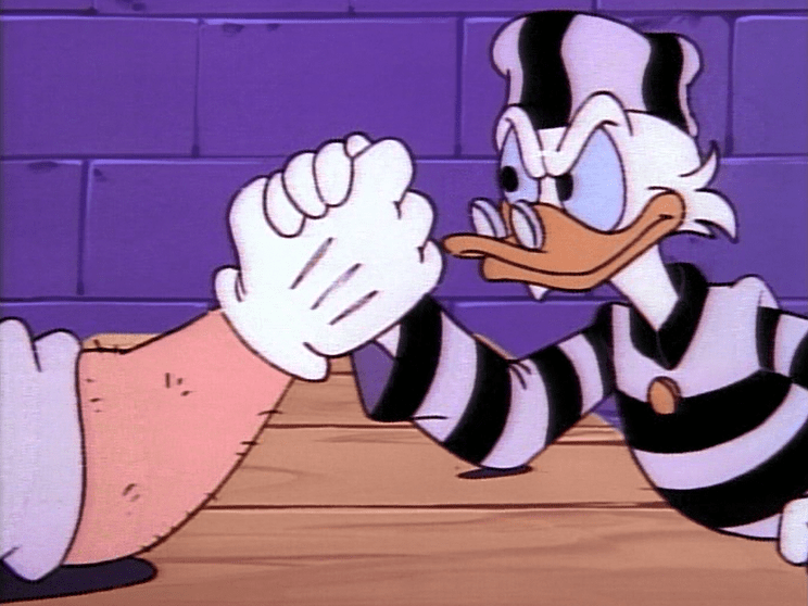 Foul fowls: Glomgold isn’t given any specific motive for framing Scrooge, other than their ongoing rivalry. He successfully disguises himself as Scrooge to fool security cameras, perhaps a comment on how the two characters are similar.