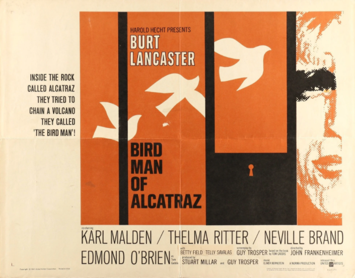 Reference row: The title refers to convicted killer Robert Stroud, the so-called “Birdman of Alcatraz,” who famously raised and cared for abandoned birds while in jail. He later studied ornithology and published two books about bird science, all while STILL in jail! His story was later told in in the 1962 film Birdman of Alcatraz, starring Burt Lancaster and directed by John Frankenheimer.