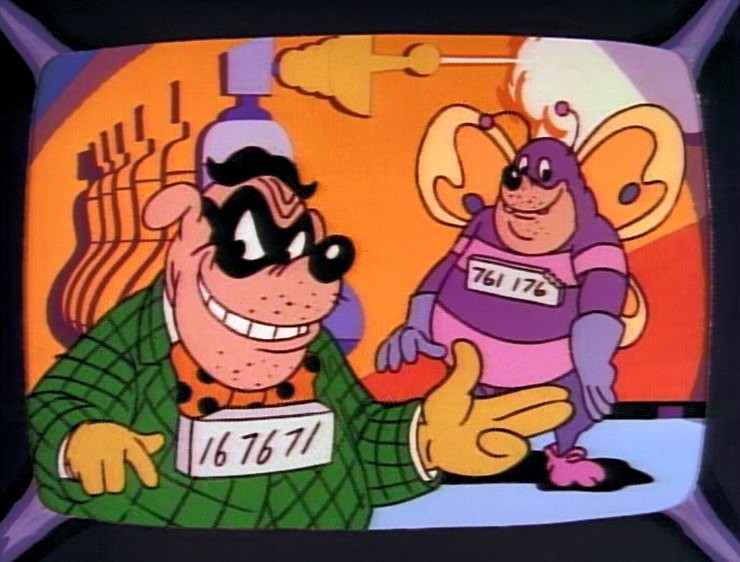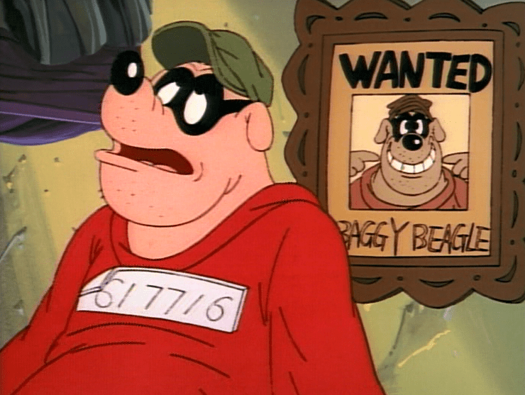 Foul fowls: The Beagle Boys this time are Big Time, Burger, Bouncer, and the first appearance of Baggy Beagle, apparently named for his baggy shirt.