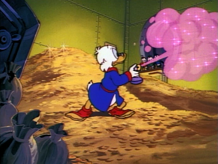 The nephews figure out what’s going on, and use the spray on themselves. They are then teleported to the Beagle Boys’ hideout along with all the cash. The spray becomes a cloud that floats all about the city, teleporting people and zoo animals to all kinds of wacky places. The nephews get a hold the ray and use it against the Beagle Boys, teleporting them back to jail. They return all of Scrooge’s money, and Scrooge insists that Gyro not invent anything else for the rest of the year.