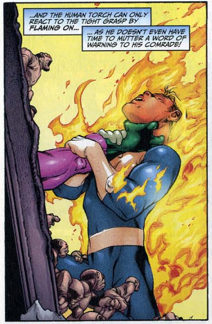 Back at Pier 4, Diablo summons a hurricane (indoors?) to fight Ben. All the little monsters join together to form one big monster, strong enough to knock Ben unconscious. Diablo then feeds a strange potion to Johnny, causing Johnny’s flame to burst around him as he screams in pain.