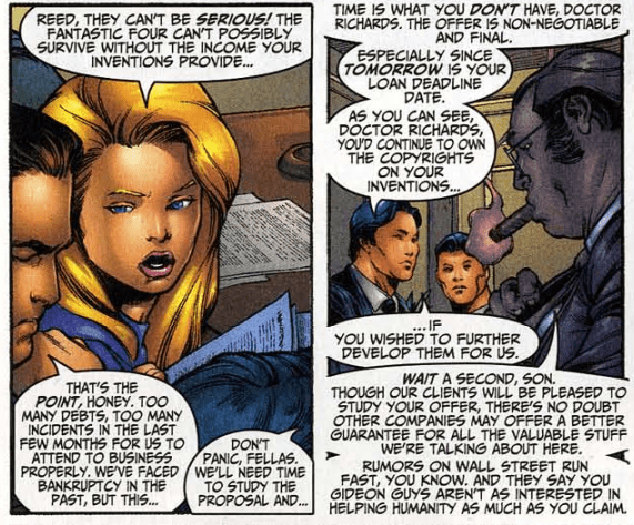 Cut to Hell’s Kitchen, where Reed and Sue are meeting with lawyers Foggy Nelson and Jeryn Hogarth, along with a roomful of other lawyers. The opposing side represents a group called the Gideon Board. They represent the late Gregory Gideon, the genius supercriminal the FF faced back in the Lee/Kirby days. But now they say they’re good guys. After appearing to be dead for several months (during the Heroes Reborn event) and then the alliance with Dr. Doom (which was really Reed trapped in Doom’s armor), the FF’s stock has fallen far, and now the Gideon Group wants to purchase Pier 4, and all of Reed’s inventions. The FF can still survive financially from patents from Reed’s inventions, the lawyers say, but only if he invents them for the Gideon Group. Reed says he’s concerned about the FF’s financial future and that he’ll sign the contract. Foggy steps in and says that Sue is both Reed’s business partner and business manager, and that the deal requires her signature as well.