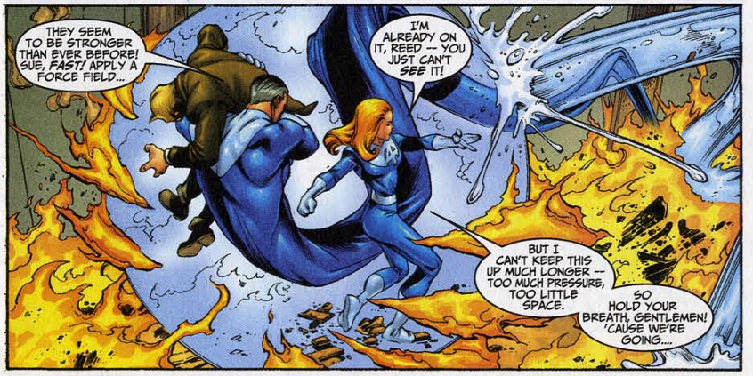 Fade out: Sue mentions trying out her force fields in the style of Iceman’s ice bridges that he moves around on. Except Sue has done this before. I guess there’s a difference between a force field bridge and a force field bridge that propels you forward with momentum.