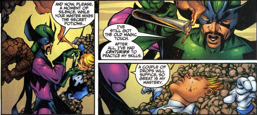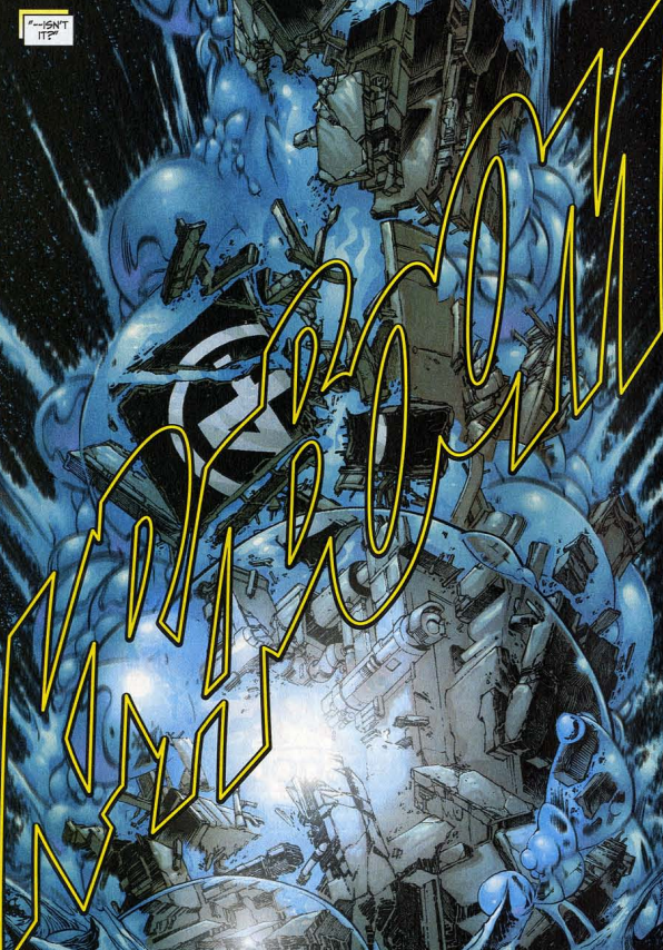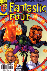 Before we begin, note that writer Chris Claremont is outta here! This issue begins a run for Carlos Pacheco as writer and penciler, with Rafael Marin as co-writer/co-plotter. It would appear that Claremont and artist Salvador LaRocca left to debut X-Treme X-Men when all the X-books got big reworking in 2001. (This is when we got Grant Morrison and Frank Quietly on New X-Men, Peter Milligan and Mike Allred on X-Force/X-Statix, among others.) My question is, with Pacheco writing, why do fans always credit Claremont with the controversial birth of Valeria, which we’re only a few issues away from? Also, the Fantastic Fourth Voyage of Sinbad one-shot won’t be published for almost a year after this, and it’s written by Claremont and continues a bunch of storylines Claremont introduced. Was Claremont still an invisible guiding hand in Fantastic Four under Pacheco, or are the fans mistaken? We may never know.