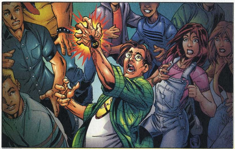 Also, this issue has a two-page preview of Ultimate Spider-Man #1. Peter Parker goes to a science lab and is bitten by a chemically engineered (not radioactive) spider. I wonder what will happen.