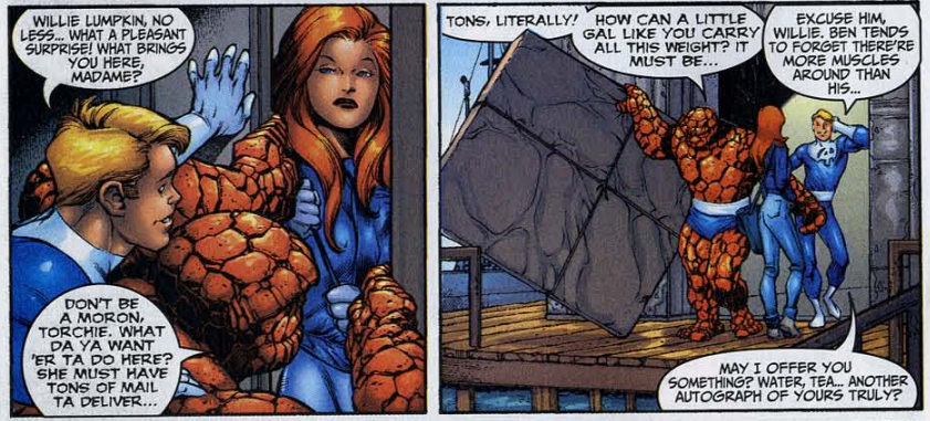Trivia time: This issue suggests that something is up with mailperson Willie Lumpkin. It’s a mystery how she carries the giant mirror by herself, and then she appears to vanish. Sadly, this is pretty much it for Willie. She won’t reappear until the Fantastic Four: True Story miniseries in 2008. Then her only other appearance is a cameo a year later. The Marvel wiki confirms Willie has no superpowers, so maybe Diablo’s magic is to blame for her odd behavior in this one.