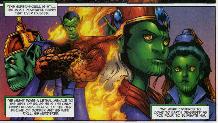 Johnny says he doesn’t care about Skrull political in-fighting. He takes the Reed-Skrull up to the roof as his alibi. Ben was also a Skrull, and he turns into a bird and flies off. Johnny deduces that FX whiz Lon Zelig has been the Super-Skrull all along. He’s right, but then Zelig/Super-Skrull uses his super-hypnotism (that he’s always had) to make everyone forget he’s a Skrull.