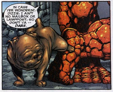 Clobberin’ time: Ben announces that he’s quitting cigars, because Sue wants the FF to have a cleaner image and hopefully get some commercial endorsement deals. This was during Marvel’s much discussed “no more smoking in comics” policy. (Lenny from Damage Control, however, continues to enjoy his cigar.)