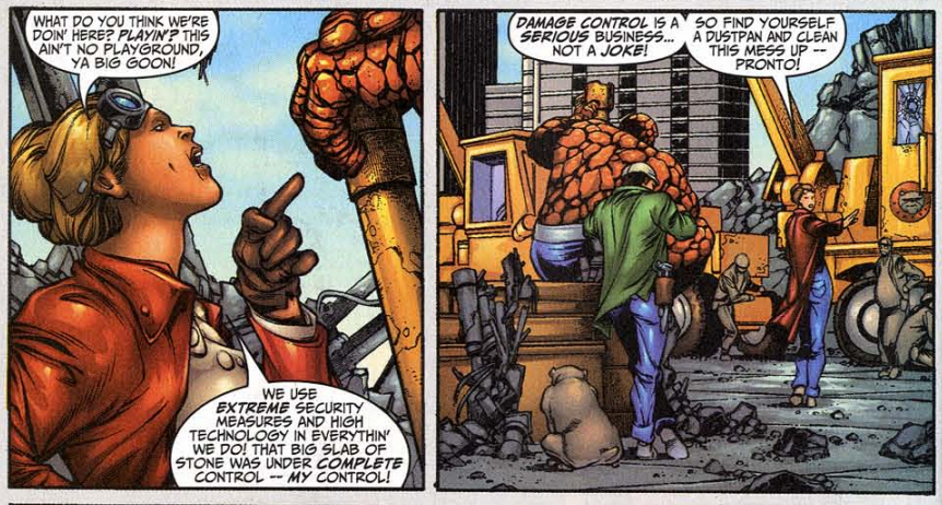 Unstable molecule: Reed mentions that Damage Control benefits from some his tech. This was established in the first Damage Control miniseries, in which Reed, Tony Stark and even the Kingpin (!) donated high-tech gear to DC.