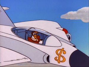 The Beagle Boys fly to Scrooge’s money bin and use the MC-X’s gadgets to bust into it, Launchpad pursues in his biplane, and his family joins him in their planes. Launchpad saves the day by successfully pulling off the stunt he failed years earlier. Launchpad’s family tells him they were always proud of him, just that he never gave them a chance to say so.