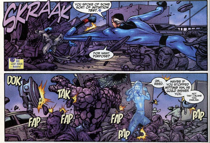 There are several pages of fighting, with Reed using his long arms to swing wide punches at Grey Gargoyle, knocking him all over the place. Sue traps him in a force field and slams him against a nearby wall. Grey Gargoyle admits that this attack was an initiation test, and the mystery woman is named Senso. She has vanished, while the FF secure the scene and put their attention toward helping Ben.