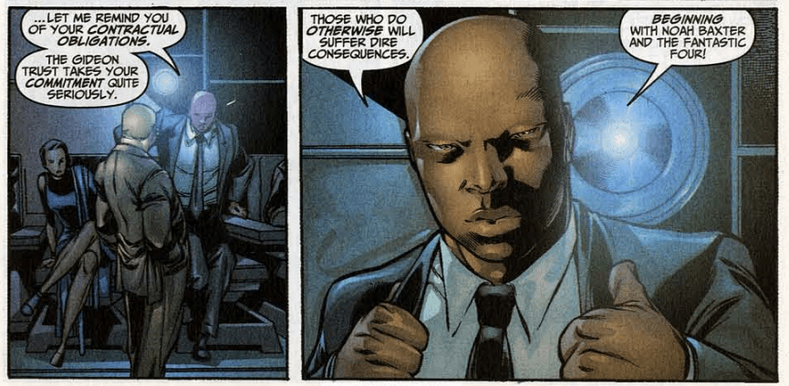 Then we cut to the headquarters of the Gideon Trust, the big business who purchased all the FF’s tech and patents. They’re experimenting on Paste-Pot Pete, um, I mean the Trapster, so he can join their new elite group, known as the “N-Explorers.” A man identified only as “the Colonel” exposits that the Gideon Trust is rebuilding the FF’s Negative Zone portal. When the Colonel threatens to leave the project, the others threaten him, and make vague threats about Noah Baxter and the FF as well.