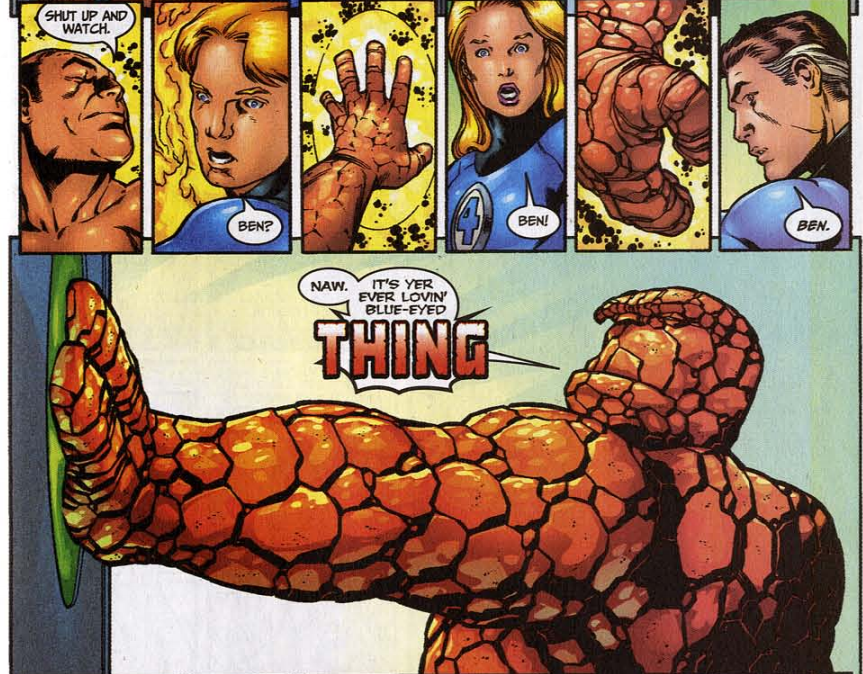 Clobberin’ time: Reed offers Ben the choice to leave the team now that he’s human again, but says he’s never felt better and that, “We ain’t called the Fantastic Three.”