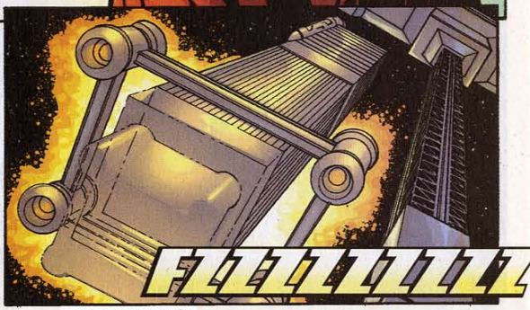 To recap, a brand-new Baxter Building is being constructed in an orbiting space station, courtesy of scientist/industrialist Noah Baxter. Ben, meanwhile, fought the Grey Gargoyle and an unnamed mystery woman, only for the Gargoyle to turn him into stone. (Well, fully into stone.) Reed, Sue, and Johnny teleport from the space station to the scene. Note that they’re wearing new uniforms, which are the original FF uniforms, only without the prominent “4” logo.