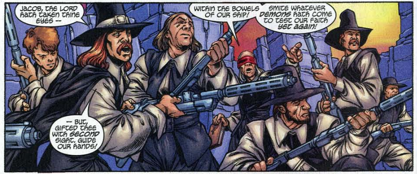 Inside the Negative Zone, Reed deduces that the old sailing ship is fifteenth century Spanish galleon named the Pandora. What’s more, the ship’s devoutly religious crew is still on board, led by a man named Jacob. (The comic refers to the crew as “pilgrims” throughout.) There’s a brief fight, until Reed recognizes Jacob carries a Bible. Reed quotes from it, convincing the pilgrims on their side.