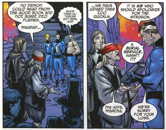 Unstable molecule: What to make of Reed quoting the Bible? I think this is less about what spirituality he may or may not have, but rather him finding common ground between him and Pilgrims. We’re not that far away from a longer story arc about Reed going all magic/supernatural, so maybe this is planting a seed of that.