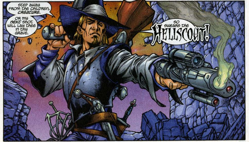 Elsewhere in the Negative Zone, Trapster and the N-Explorers are fighting a bunch of aliens to steal their powerful energy generators. He contacts the Gideon Trust, who plans to profit from the generators. Back aboard the Pandora, Jacob explains that the pilgrims’ ancestors were sailing to the New World back the olden days and got caught in a storm, which transported them to the Negative Zone. Nearby, Ben is attacked by a gun-toting man calling himself the Hellscout. It’s a brief fight before Jacob breaks them up, saying Ben is a guest and not a foe.