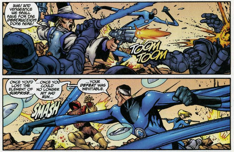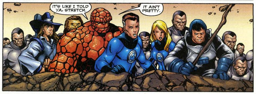 Also on Earth, She-Hulk defeats the Android by punching it out, and then the Ad-Hoc team enters the portal chamber. Then it’s back to the NZ, where Reed has converted the FF’s old signal flare gun into a weapon able to interrupt the portal. Maximus and the Alpha-Primitives attack the N-Explorers as a distraction. Reed trusts Hellscout’s perfect aim to fire the weapon into the portal. On Earth, the portal explodes, and Johnny sees an image of the “4” flare in the blaze. He orders his new teammates to retreat while he absorbs the flames. Back to the Negative Zone, where Reed beats up the Trapster and Hellscout defeats a weakened Annhilius. Hellscout stabs Annhilius in the back with two swords, seemingly killing him.