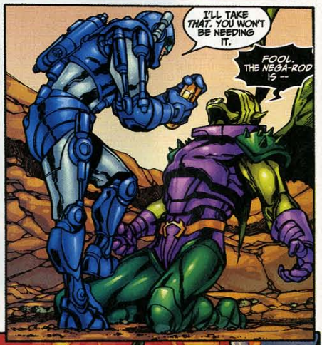 In the Negative Zone, the FF, Hellscout, an alien named Gornkai, Maximus, and Maximus’ army of Alpha-primitives come across the Gideon Trust’s team of N-Explorers, led by Paste-Pot Pete, um, I mean the Trapster. They’re fighting Annihilus, who they’ve snagged in one of the Trapster’s traps. The Trapster removes Annihilus’ powerful Cosmic Control Rod. He sends the rod through a portal to Earth.