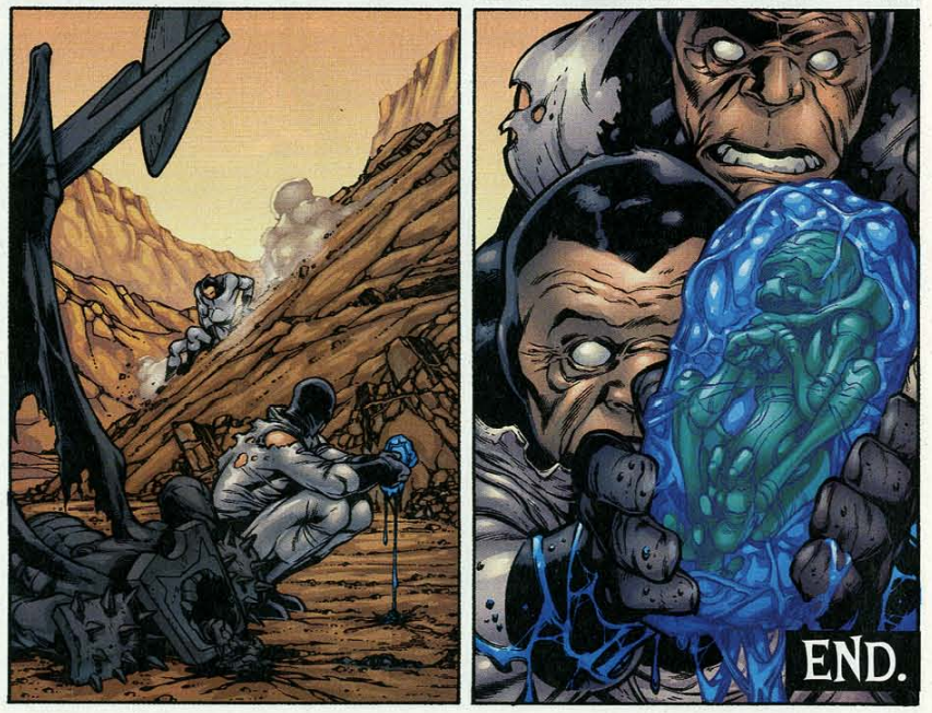 Cut to Lake Tahoe, home of another secret Gideon Trust facility. The Gideon board members are all laid off by the unseen leader of the trust, with a threat that they will be dealt with severely if they ever talk. The final page returns to the Negative Zone, where two Alpha-Primitives discover an egg with what looks like a tiny baby Annihilus growing inside it.