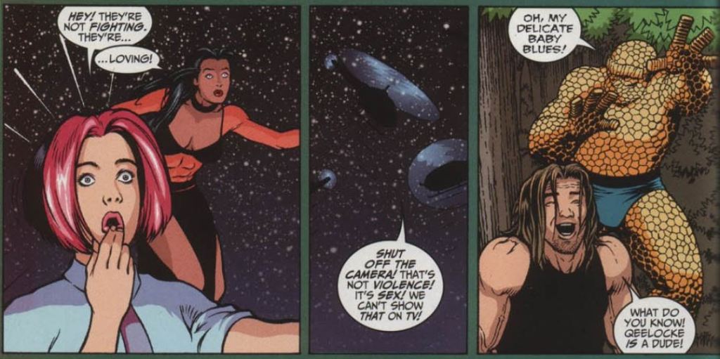 The FF and Gen 13 work together to stop Queelocke, who has also grown to Godzilla size. No matter what they do, they can’t stop Queelocke from marching forward. Queelocke and the monster confront each other in Central Park. Instead of battling to the death, they start, as Rainmaker puts it, “loving.” Everyone’s reactions to this are really funny, and worth the cost of the comic.