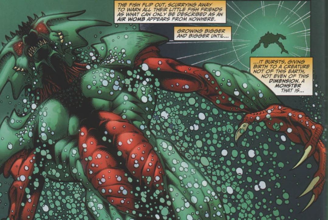 At the new Baxter Building, Reed discovers a spatial displacement out in the ocean. He and Sue take off in a Fantasticar to investigate. In the ocean, we see a Queelocke-like monster emerge from a portal deep underwater. The monster looks menacing, but the caption tells us it’s only two feet tall.