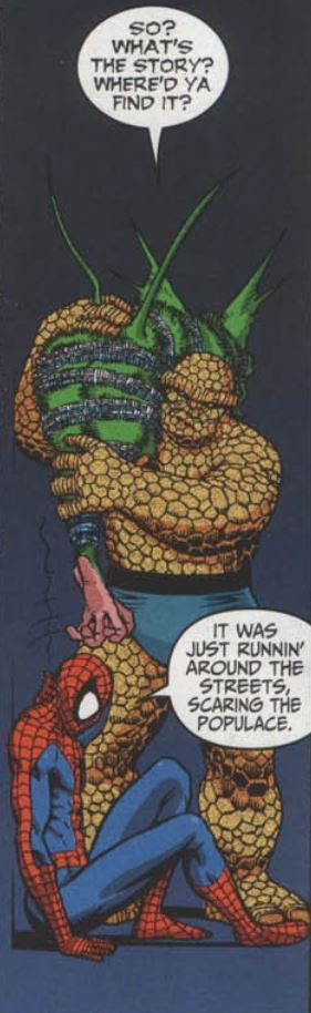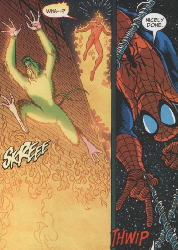Gen 13 return to their, where they learn Queelocke has escaped the building and is running loose in NYC. They split up to search for the little guy. Nearby, Johnny and Spider-Man are out on patrol together, bantering about whether it’s better to be a solo hero or part of a team. They encounter Queelocke, who has gone feral. There’s a brief fight, ending with Spidey wrapping up Queelocke in webs. Johnny makes Spidey carry the alien to the Baxter Building by himself to get back at him for saying solo heroes are better than team heroes.