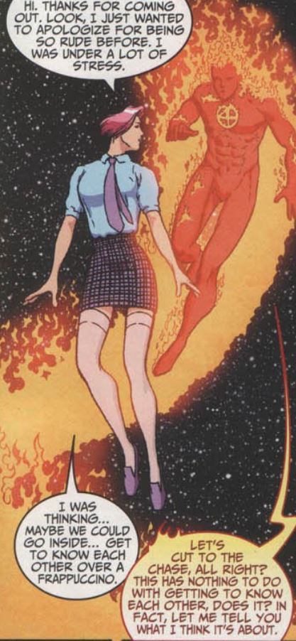 On the way back to the Baxter Building, Johnny meets Freefall on a rooftop. She thinks he’s Burnout at first, but quickly realizes he’s the famous Human Torch. They flirt for a few seconds and then Johnny flies back to HQ. Johnny, Ben, and Spider-Man lock Queelocke up in a containment cell, but they note that Queelocke is rapidly getting bigger and bigger. Spider-Man takes off, leaving the alien in the hands of the FF.