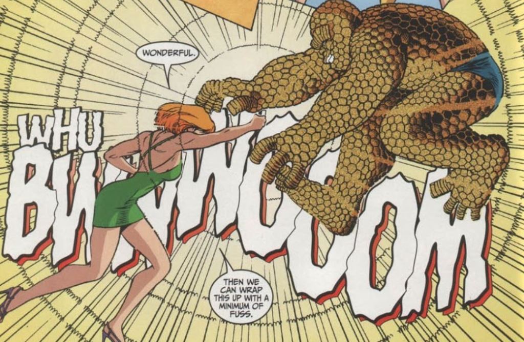 Clobberin’ time: Unlike Marvel’s Absorbing Man, Grunge can absorb more than just rock and metal. He can turn into water or go paper-thin. And in this issue, when he touches Ben, Grunge absorbs Ben’s rocky skin.