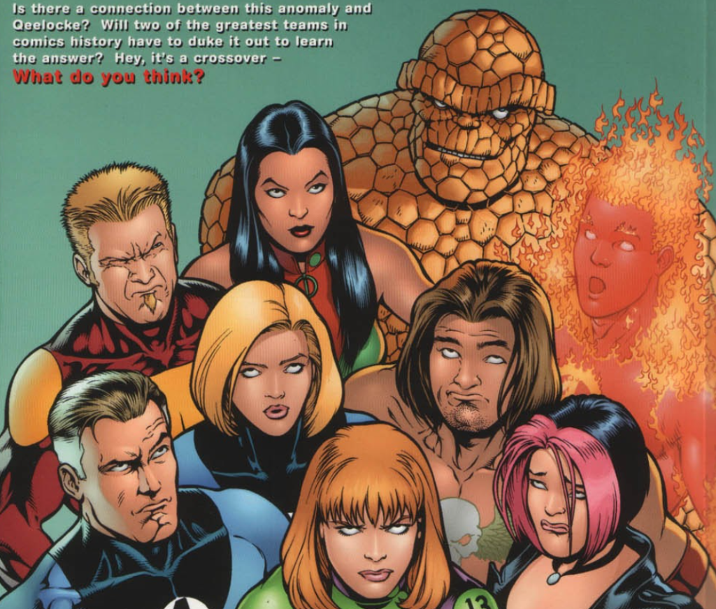 A fight breaks out, with Fairchild and Grunge holding their own against Ben, and Burnout and Johnny having a fire-off. Burnout actually wins the fight with an enormous blast of heat at Johnny. Johnny absorbs the blast, but it’s so much heat that it knocks him out for a bit. Gen 13 try to open the containment unit to free Queelocke, but accidentally open the Negative Zone portal instead. The young heroes are almost sucked into the Negative Zone, but they’re rescued by Reed and Sue retuning to the Baxter Building.