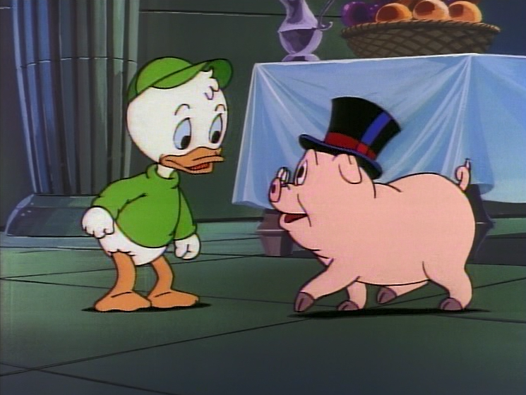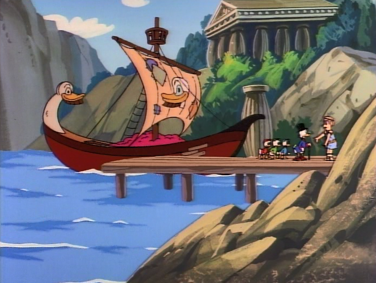 Once Circe deduces that Scrooge is not a sorcerer as she feared, Circe transforms Scrooge and Homer into pigs. Huey, Dewey and Louie later sneak into the palace and find out what happened. The boys steal Circe’s magic medallion, and she puts up a chase. The boys break the medallion, which undoes all of Circe’s spells. This also unleashes a second magic storm that sends Scrooge and the nephews back to the present. They’re then rescued by Donald’s Navy battleship.