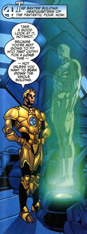 Unstable molecule: Reed dons a new version of his thought projector (from back in the Lee/Kirby days as well The Fantastic Four Roast) to help deliver exposition.