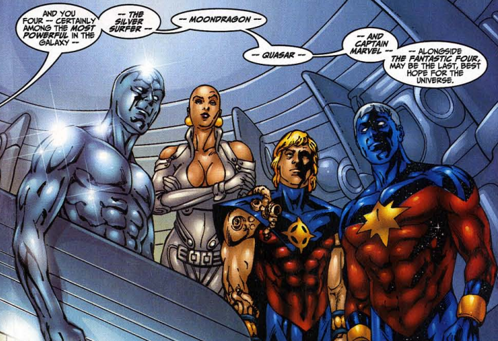 The battle ends when an image of Abraxas appears in the sky overhead. Moondragon telepathically scans Johnny, and determines that Johnny was also Abraxas’ target. Back during the original Galactus storyline, the Watcher selected Johnny to fly through space to obtain the Ultimate Nullifier, which could defeat Galactus. Abraxas wants the power of the Nullifier for himself, and Johnny must make that same journey again. But there’s another complication. Captain Marvel uses his “cosmic awareness” to determine that the Nullifier hidden in one of three places throughout the multiverse.