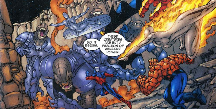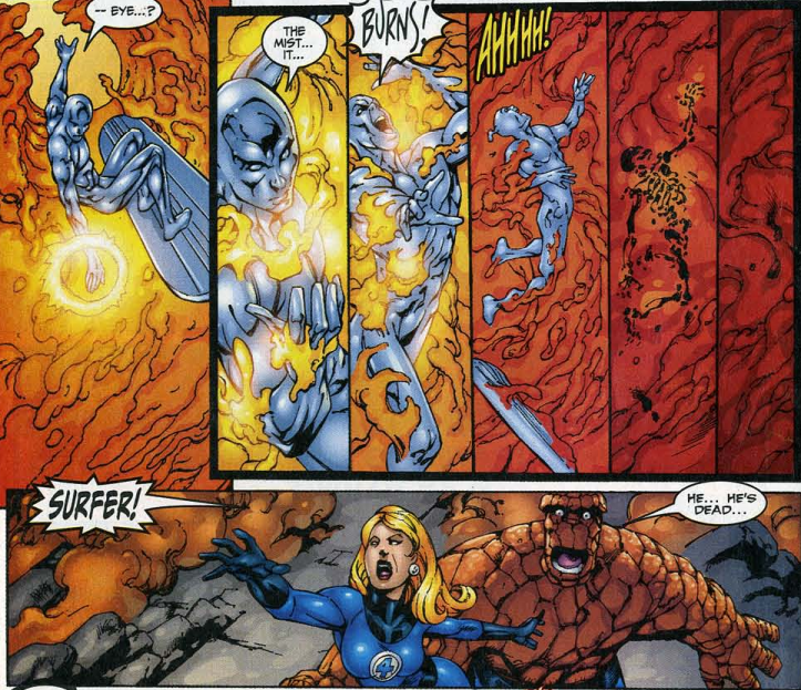 The FF travel to the Watcher’s home on the moon, where the Watcher is comatose. They’re joined by the Silver Surfer Captain Marvel, Quasar, and Moondragon. (Note that this is the Rick Jones/Genis-Vell version of Captain Marvel from the fan-favorite Peter David series.) We learn a little more about Abraxas, how he is traveling from universe to universe, leaving death and destruction behind in each one. The meteors come crashing down, only they’re not meteors but armor-clad aliens. These are Abraxas’ troops. The heroes fight them off for a few pages. The aliens are after the Watcher’s body. The Silver Surfer flies in and teleports the Watcher away, but a great cost. The Surfer is consumed by the aliens’ flame weapons, and… he dies!