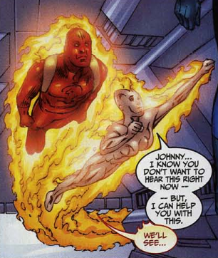 Flame on: After all the drama of having Johnny trapped inside this suit of armor, it’s jarring to see him standing around without it at the end of the issue. I’m hoping this will be addressed in upcoming issues.
