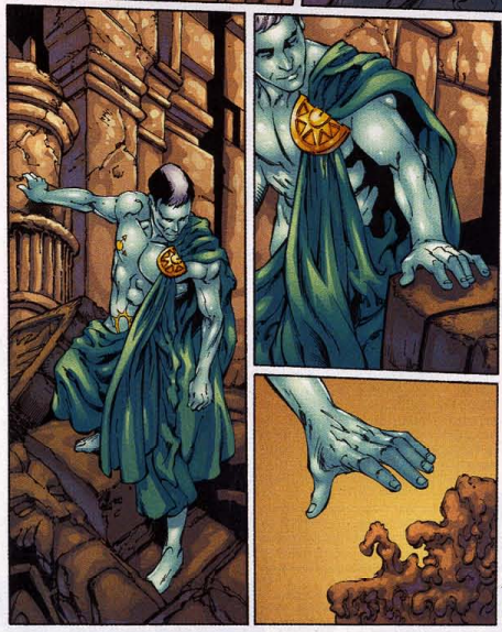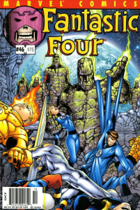 Previously, in the 2001 annual, various alternate timelines were converging onto the Marvel Universe proper. The cause of the disturbances is a godlike being named Abraxas (no, not the one from the Jesse Ventura movie), who stole the Watcher’s medallion, leaving the Watcher with no memories. This issue begins with the Reed and Sue consulting with Code Blue, the NYPD’s superhuman crimes division. They’re reunited with Franklin and time-displaced teenage Valeria.