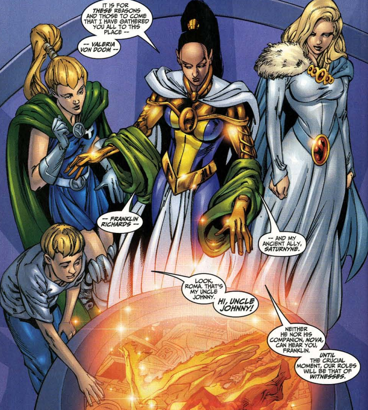 We begin in Haven, at the center of the multiverse, where Franklin and time-displaced teenage Valeria are meeting with Roma, daughter of Merlin and self-proclaimed guardian of the multiverse. Also present is Saturnyne, an interdimensional evil queen, who was last seen worrying about Franklin’s potential reality-bending powers. I guess she came around because now she’s on Franklin’s side.
