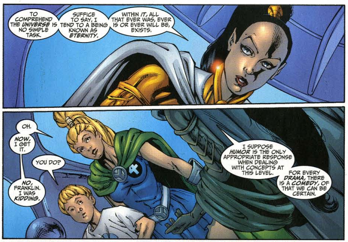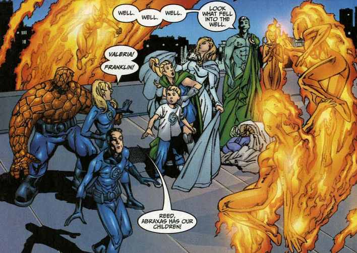 Johnny, Nova, and Abraxas appear in Haven. (Does this mean the Nullifier was in Haven? It’s not clear.) Abraxas says this Nova is his herald, working for him all along. Abraxas explains that he seeks perfection, and perfection can only be achieved in nothingness, hence his goal to destroy all universes. Back on Earth, Reed, Sue, and Johnny return to the new Baxter Building, only for Abraxas to join them, with Franklin, Valeria, Johnny, Nova, and Saturnyne with him. Nova gives the Nullifier to Abraxas. He says now that he has it, there isn’t a soul all the combined universes who can stop him. The final panel is a closeup of Franklin as Abraxas repeats, “Not a soul…”